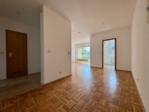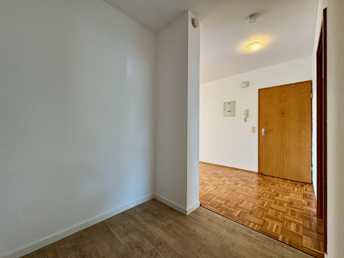 Nach dem Betreten der Wohnung gelangen Sie in einen zentralen Flur, von dem aus alle Räume praktisch erschlossen sind. Linker Hand befindet sich das Tageslichtbad, rechter Hand die beiden gut geschnittenen Schlafzimmer. Der großzügige Wohn- und Essbereich bildet das Herzstück der Wohnung und überzeugt durch seine angenehme Raumwirkung sowie den direkten Zugang zum südöstlich ausgerichteten Balkon, der sich über die gesamte Breite des Wohnzimmers erstreckt und viel Tageslicht bietet.